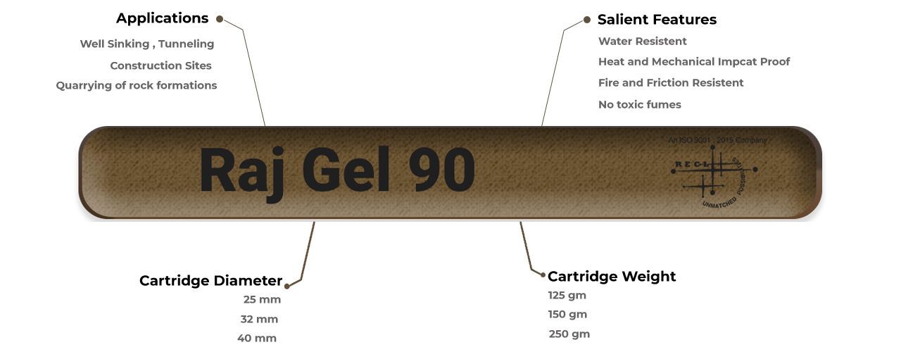 RAJ GEL 90 is used in quarrying , well sinking, tunneling, secondary blasting, construction work and for general purpose involving small diam hole blasting.